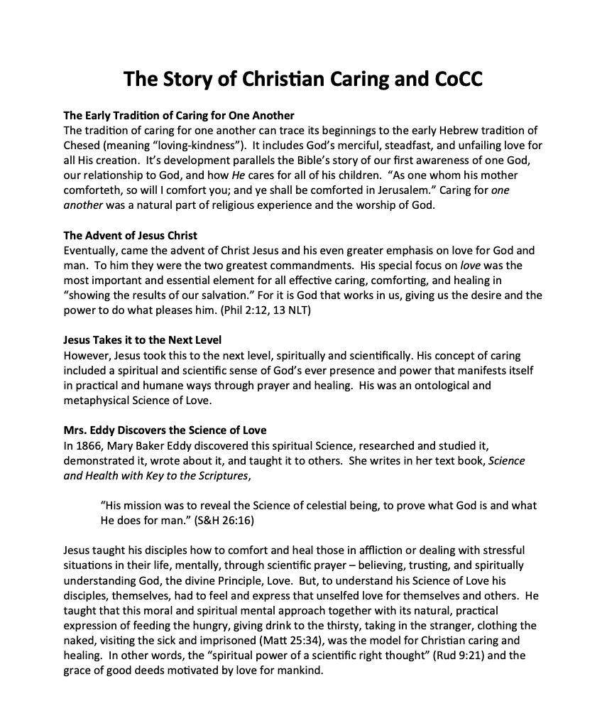 In 2018, the Christian Science Communities of Christian Caring (CoCC) was established as a Working Group of the Christian Science Nursing Collaborative. It began as a small group of individuals who had served the ministry of Christian Science nursing in various capacities for many years.